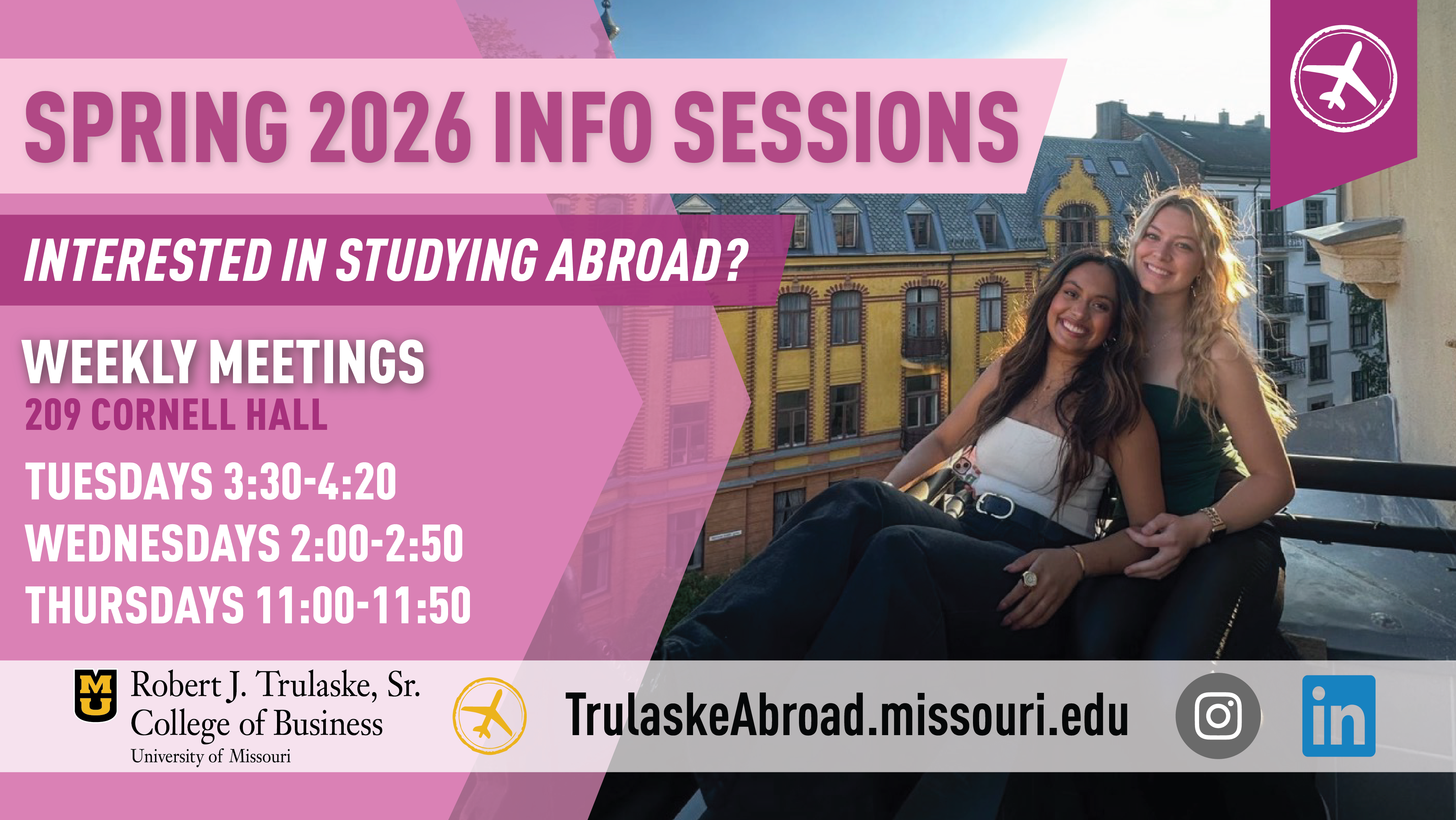 - All students must attend a Trulaske Abroad Info Session before being accepted into the program